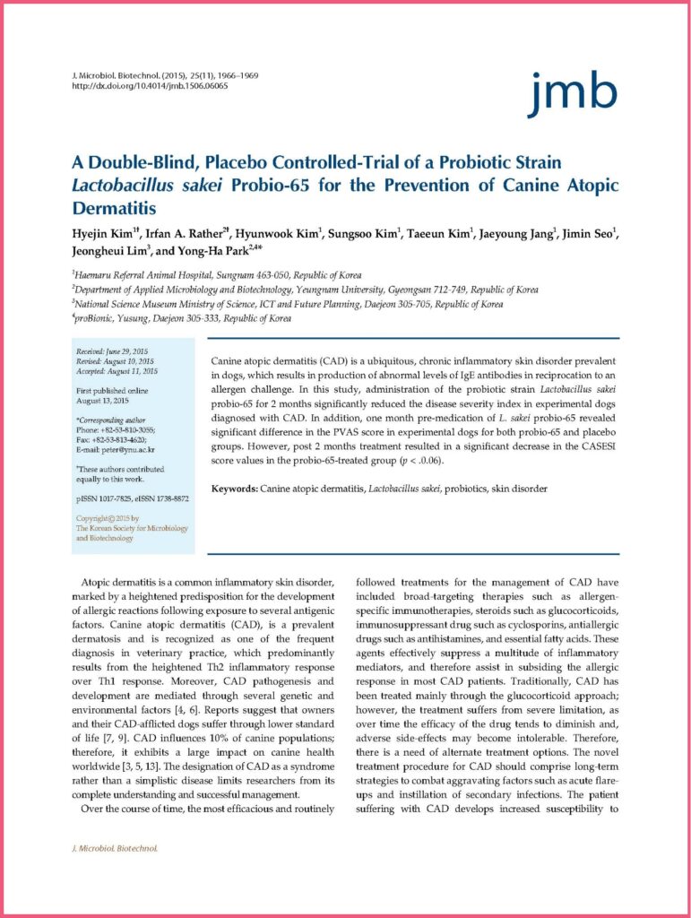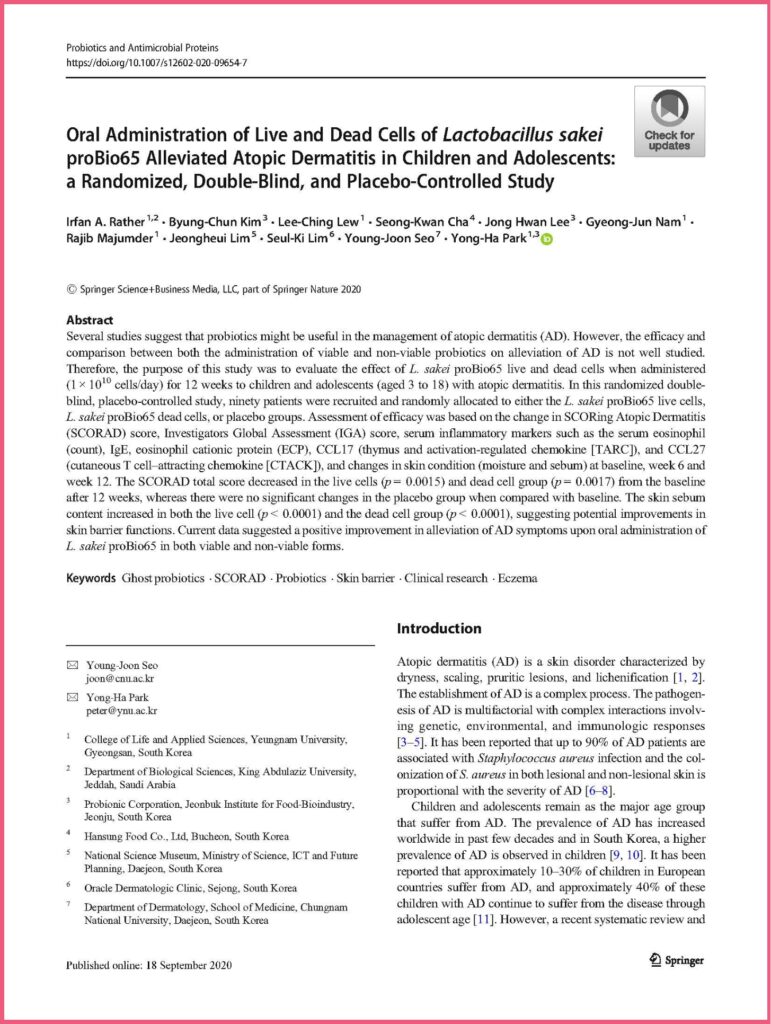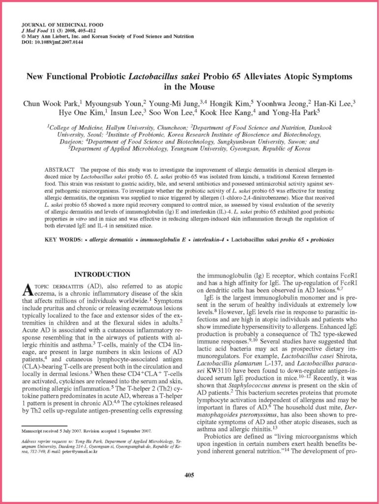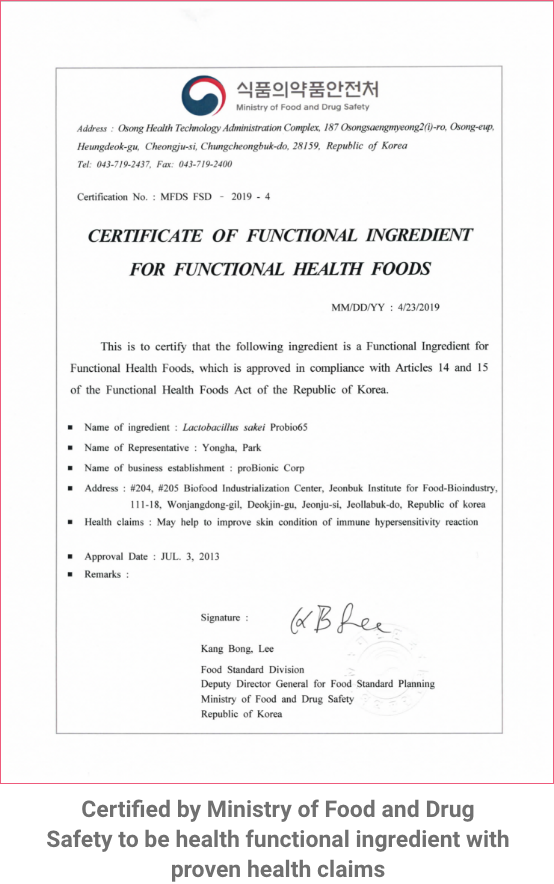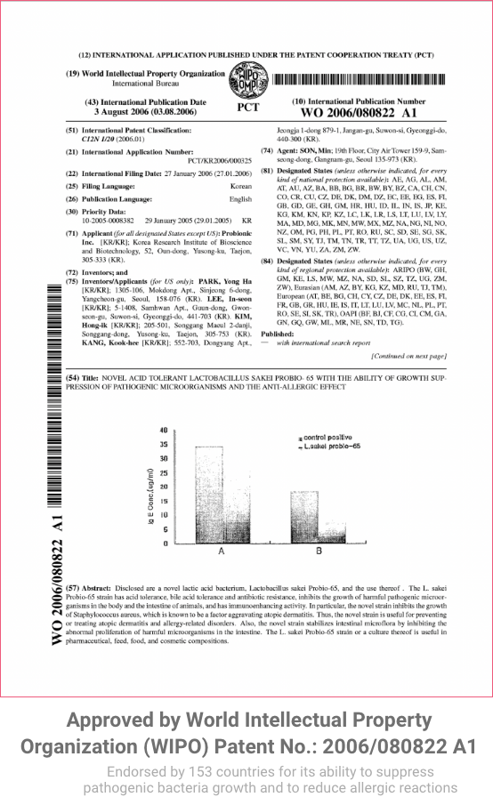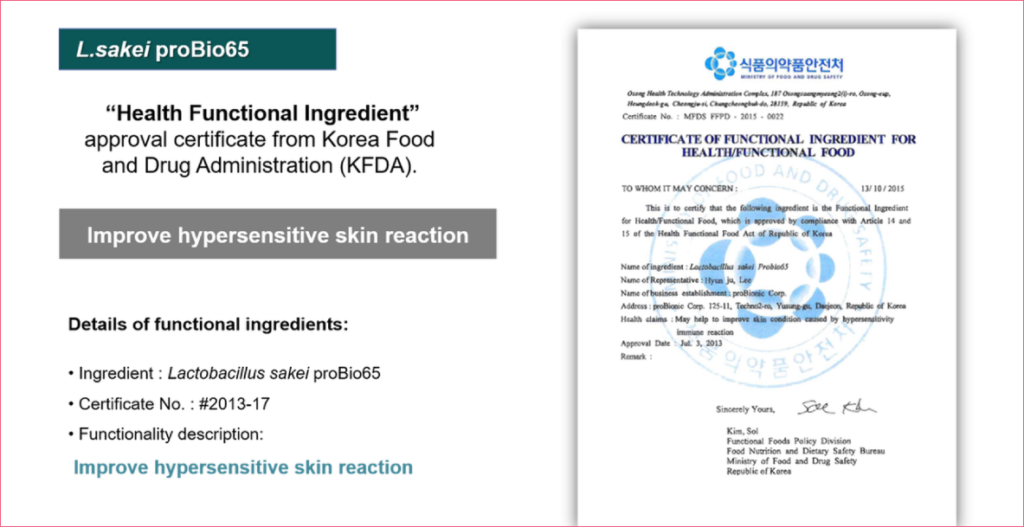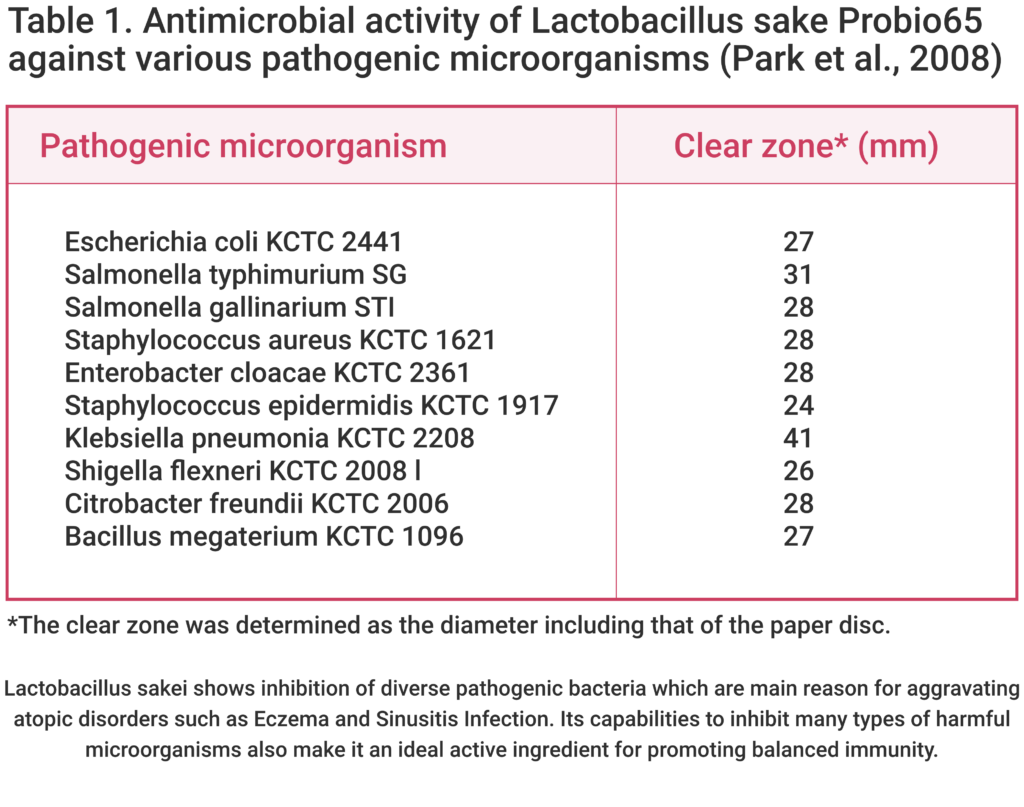 Many clinical studies show its improvement in allergic reaction via immune cell modulation and its capability to suppress proliferation of harmful microorganisms. Studies specifically showed that Lactobacillus sakei ProBio65®️ effectively inhibits proliferation of harmful microorganism such as Staphylococcus aureus (S.aureus), Escherichia Coli (E.coli), and Corynebacterium tuberculostearicum (C.t.). S.aureus has been identified the main factor for aggravating atopic dermatitis disorder, while increase in abundance of C.t. presence in chronic sinusitis patients.