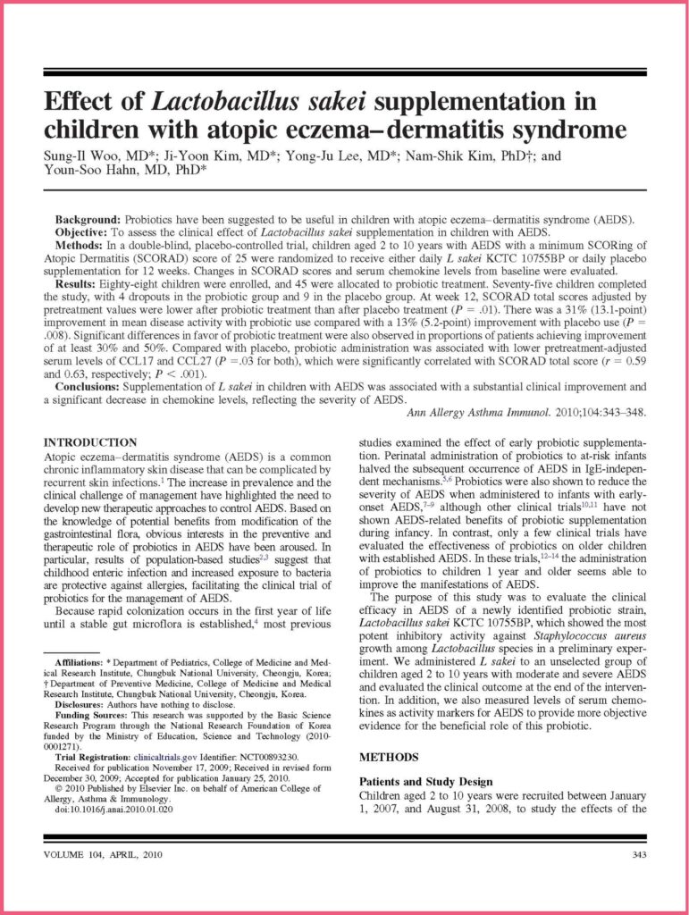 In a double-blind, placebo-controlled trial, children aged between 2-10 years who have been supplemented with Lactobacillus sakei for 12 weeks showed substantial clinical improvement with their Atopic EczemaDermatitis Syndrome.