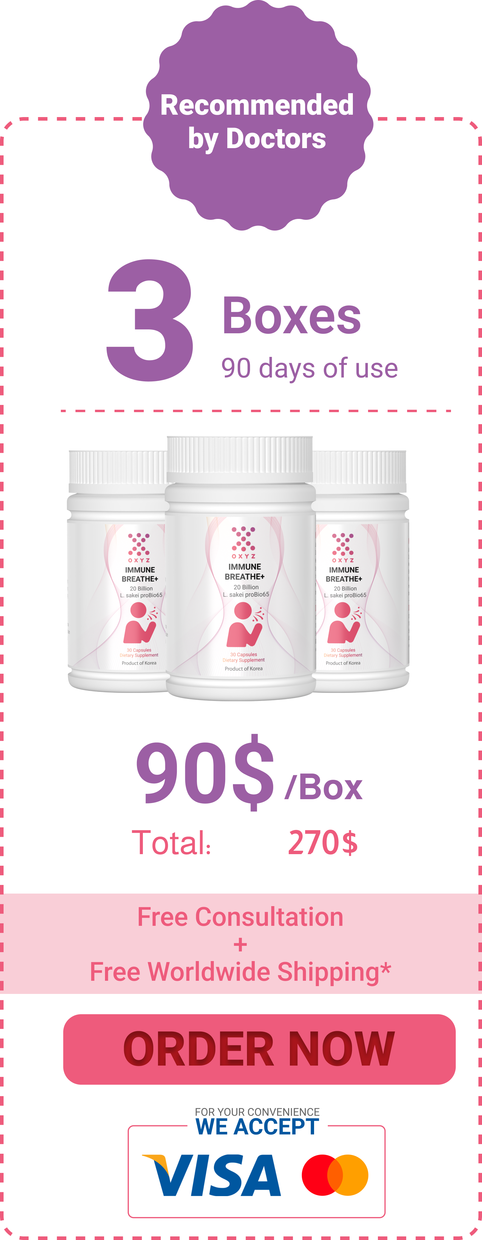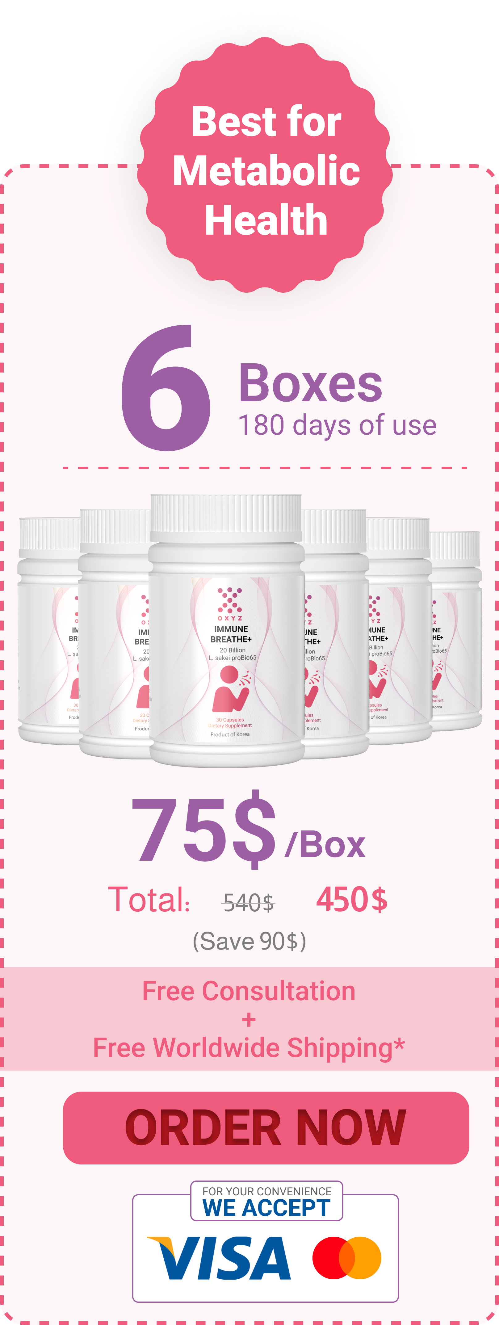 Immune Breathe+ contains a significant dose of 20 Billion CFU of Lactobacillus sakei Probio65®, and filled with all-natural Vitamin C, Prebiotics to promote healthier gut microflora, improve upper respiratory and skin health, and to promote balanced immunity.